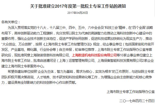 數(shù)造科技獲批建立滬上首家“院士專家工作站”